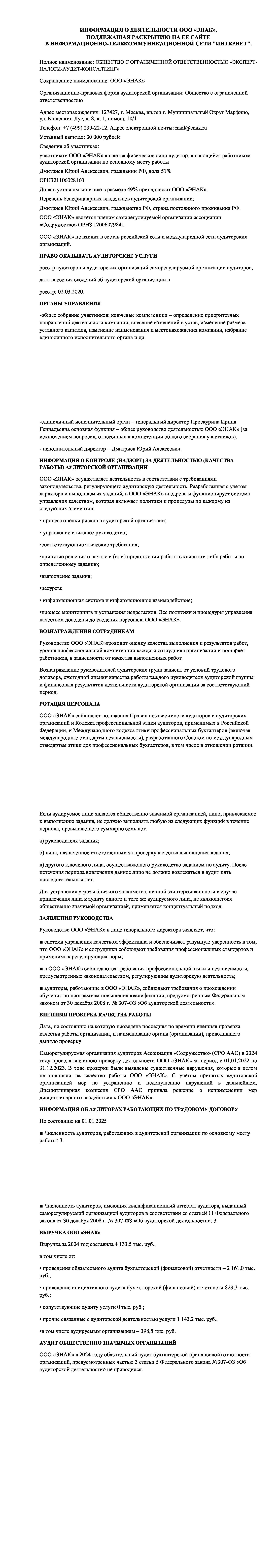 Риск профессиональной ответственности ООО «ЭНАК» при осуществлении аудиторской деятельности застрахован в СПАО «Ингосстрах» по Договору № 433-561-070291/25 от «11» апреля 2025 г.